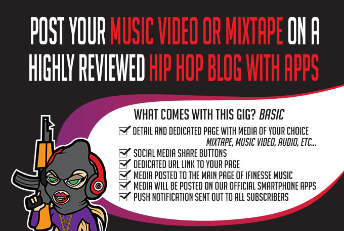 For only $15 I will Finesse your hip-hop music video or Mixtape and post on the front page of iFinesseMusic a rapidly growing new wave hip-hop blog with native smartphone apps. Not only does this provide great targeted promotion, it will create brand awareness for your name, Music Videos, Mixtape, or whatever other projects you have coming up